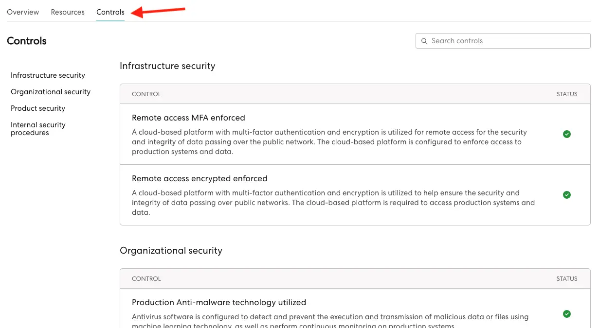 - Controls: you will frequently see a taxonomy of various controls that the organization claims to have -- e.g., controls related to Security & Privacy, Organizational Security, Product Security, and more. (example)